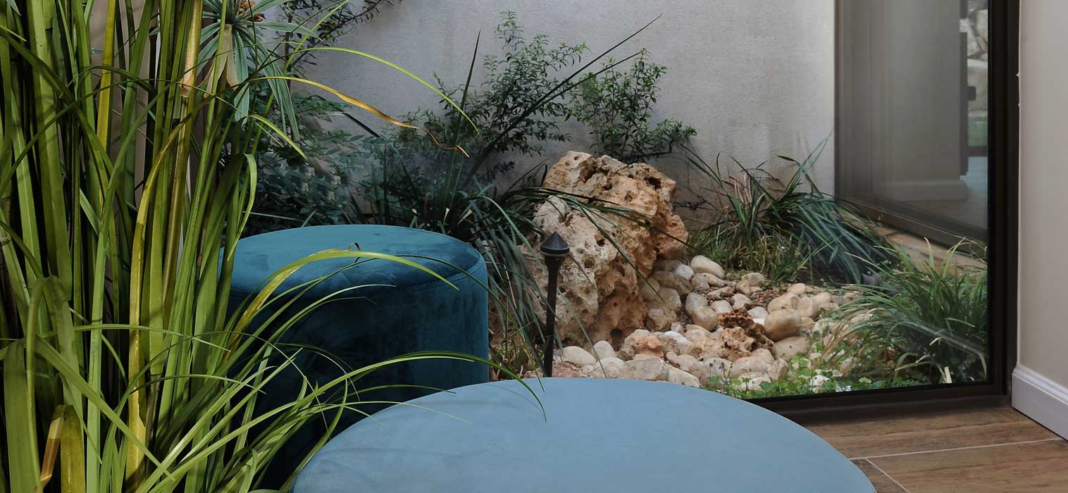 “We created many new openings so that a lot of natural light could enter the house along with the wonders of the outside garden. We also fashioned a few spaces within the living area for various entertainment options. Warm materials were selected for a contemporary-classic style along with a monochromatic palette with delicate color touches. Carpets complete the warm look and feel of the space.“